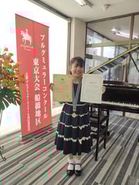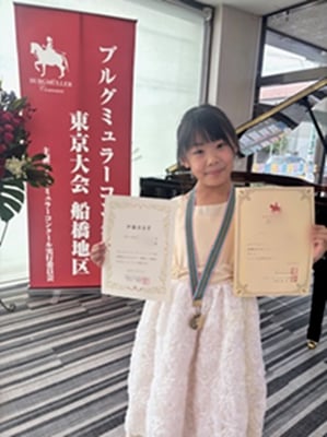 小学2年生Mちゃんが、ブルグミュラーコンクール船橋地区予選にて優秀賞で予選を通過、併せて伊藤楽器賞を受賞されました。メダルをかけてとても嬉しそうなMちゃんです。
